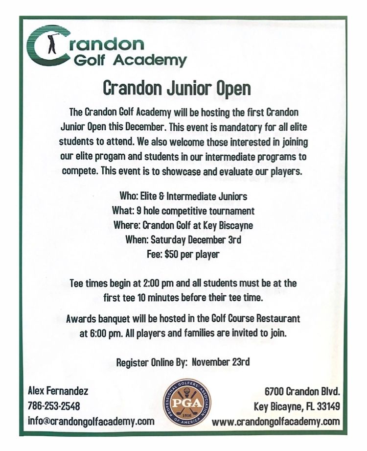 The Crandon Golf Academy will be hosting the first Crandon Junior Open on December 3rd. Registration deadline is November 23rd and there is a limited field. There will be an awards banquet following the event at 6:00 pm in the restaurant for players and parents.